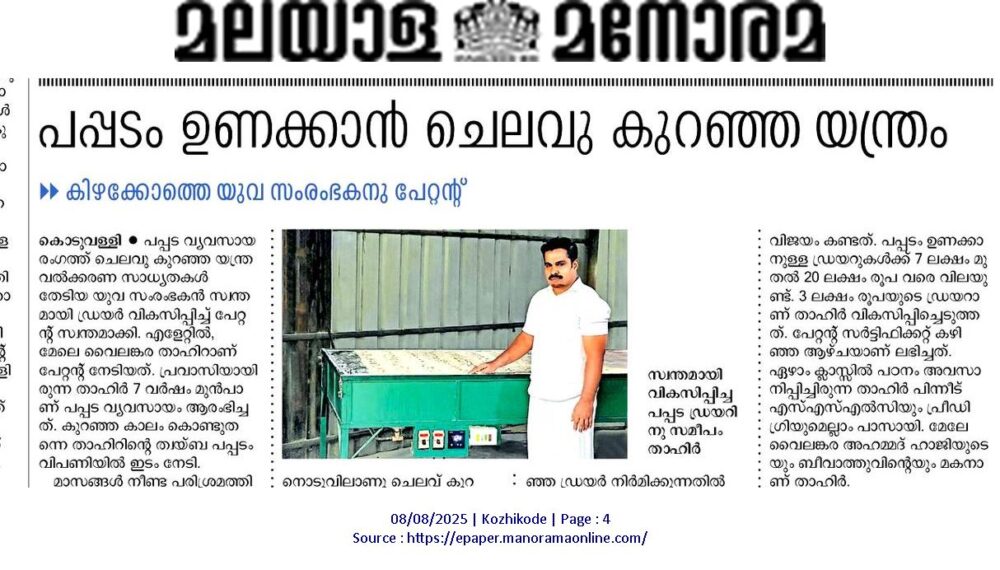 Born from real challenges faced in Kerala’s pappadam industry, the Thwaiba Papad Dryer Machine is now trusted across India. It combines Kerala’s authentic food tradition with modern technology, helping pappadam manufacturers grow their business in a cost-effective way.